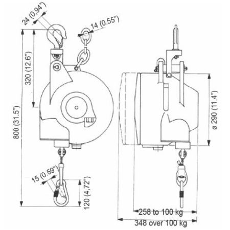 Features | Reaction free: holds the load weightless throughout the entire cable length Rigid and impact-resistant aluminum housing 360° swiveling safety hook Cable extension limit stop for overload protection Screw-type safety hook for load suspension Standard safety chain Standard spring fracture safeguard integrated drum lock Ferrule for securing cable end Freewheel device for protection against handling errors Capacity: 130 – 140 Kg (286,6 – 308,6 lb) Cable length: 3 m (9,8 ft) |