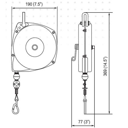 Features | Spring balancer with drum lock features Steel housing Steel cable Additional support chain included Capacity: 2 – 5 Kg (4,4 – 11 lb) Cable travel: 2,4m (7,8 ft) |
