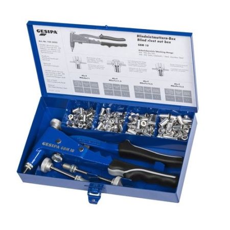 The blind rivet nuts box contains the GBM 10 hand-operated blind rivet nut setting tool and four sizes of blind rivet nuts and threaded mandrels. The hand-operated tool features a simple system for stroke adjustment by means of the knurled nut with stroke scale to ensure secure and complete installation of the blind rivet nut. Threaded mandrel locking by means of a lock washer ensures the mandrels can be changed quickly without the need for tools. The GBM 10 features an ergonomic, non-slip sleeve grip, and the opening spring allows the tool to be handled easily while installing blind rivet nuts.