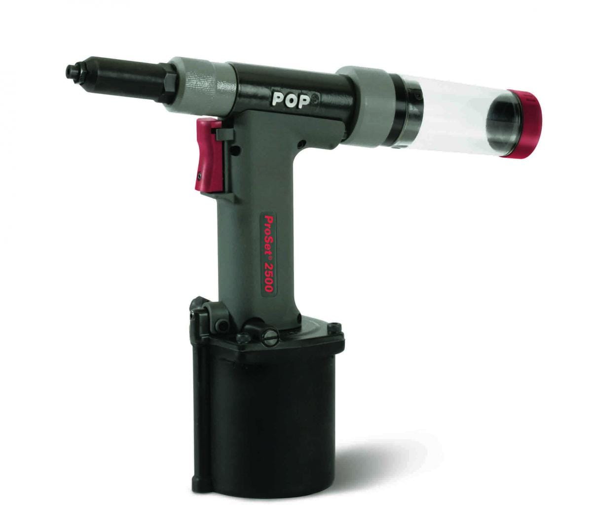 The Pop ProSet® 2500 tool sets new standards for pneumatic rivet tools. Designed specifically to set a wide range of blind rivets, including 3/16″ (4.8mm) High Strength and Stainless Steel. It delivers 2,110 lbs. (9.4 kN) of pulling force with a “highest in class” force-to-weight ratio of 730 lbf/lb (7.18 kN/kg).