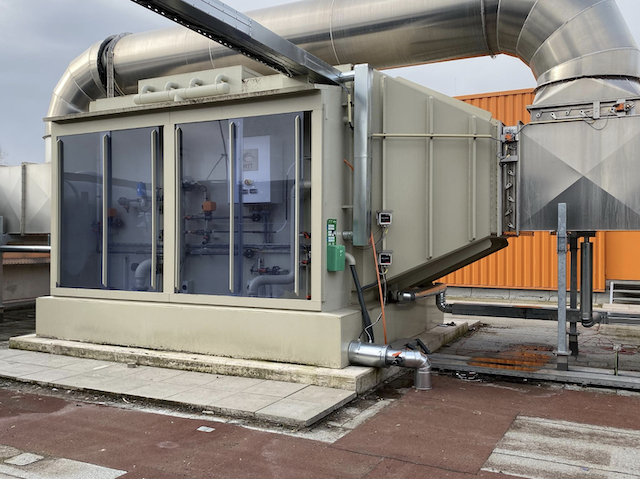 Odour abatement systems are at the core of each organic waste treatment facility. The buildings are ventilated to remove dust from the work environment. In addition, process air is treated with a wet-scrubbing process to remove ammonia. The dust containing air that is extracted from the work environment tends to cause blockage in the wet-scrubber. To solve this issue, WTT developed a two-stage acid scrubber. This scrubber reduces pressure losses and decreases energy consumption. In addition, maintenance costs can go down with 50% and downtime is reduced.
